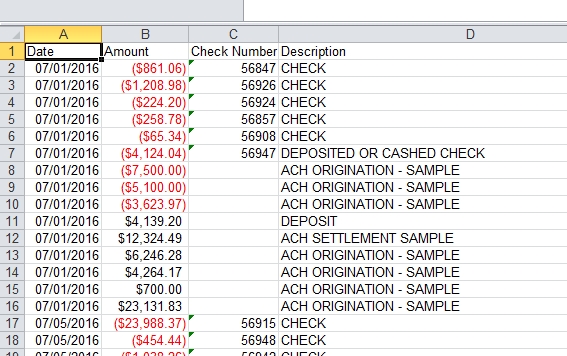 Any standard bank file will work. The columns on this report need not to be the same as your bank file. The important thing is that you can download the bank file into a csv for Excel file format. If you can do that, the bank reconciliation is almost good as done.